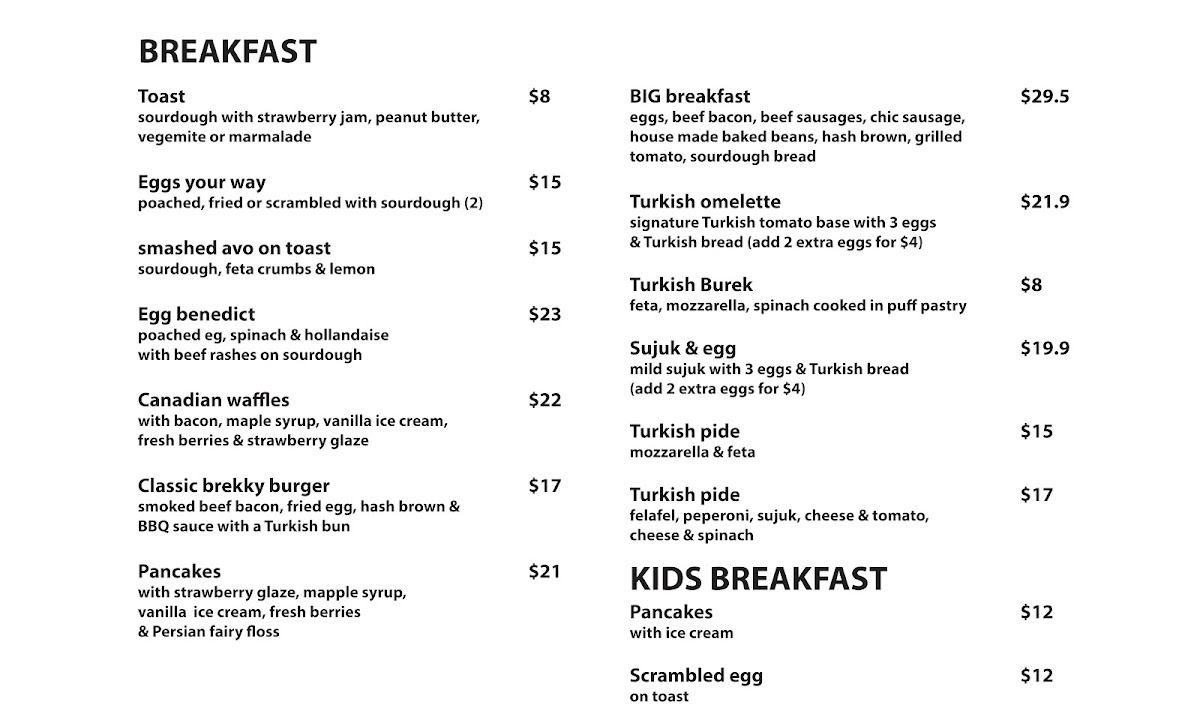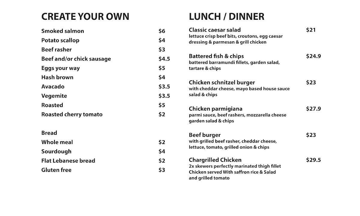 In addition to the array of drinks, the menu also includes food items typically enjoyed during breakfast or light meals. Based on customer feedback, options such as mixed grill plates, smashed avocado on toast, chicken Caesar salad, lamb shank, and beef burgers are available, which provide a range of savory choices.
